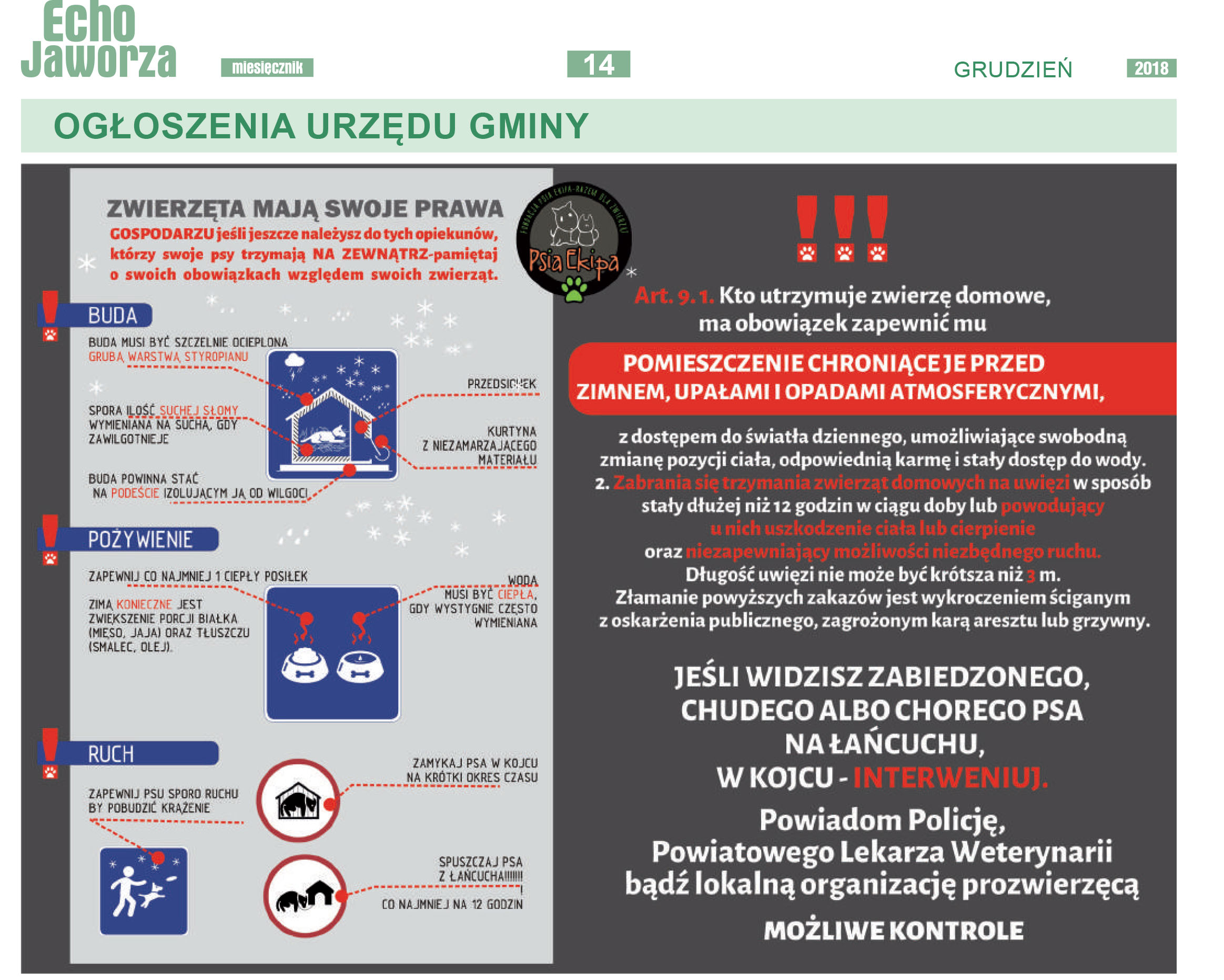 Zadaniem gmin i urzędów miasta jest dbanie o dobrostan i godne warunki życia zwierząt żyjących na ich terenie. W ostatnich latach dostajemy bardzo dużą ilość zgłoszeń dotyczącą złego traktowania zwierząt na terenie Podbeskidzia. Problem jest na tyle duży i złożony iż wymaga podjęcia działań nie tylko interwencyjnych ze strony organizacji prozwierzęcych, które tak na prawdę nie rozwiązują problemu w wymiarze dostatecznym, ale wymagają podjęcia działań edukacyjnych na terenie gmin, oraz uświadamiania mieszkańcom że zwierzęta mają swoje prawa. Z przykrością musimy stwierdzić, że warunki w jakich utrzymywane są zwierzęta w okolicznych gminach przypominają średniowieczne praktyki i nie mają nic wspólnego z postępem i edukacją godnymi XXI wieku. Pierwszą gminą, która chętnie podjęła współpracę z naszą Fundacją jest gmina Jaworze. Od listopada w gazetce “Echo Jaworza†publikowane są artykuły i plakaty informujące mieszkańców o prawach zwierząt, oraz obowiązkach właścicieli względem swoich podopiecznych. W ostatnim grudniowym numerze opublikowane zostały również porady jak przygotować zwierzę do nocy sylwestrowej pełnej odgłosów fajerwerków. Bardzo cieszymy się z tej owocnej współpracy gdyż wierzymy, że przede wszystkim poprzez edukację możemy poprawić życie zwierząt na Podbeskidziu. Inne gminy gorąco zachęcamy do brania przykładu z Jaworza i zaangażowania się w podobną inicjatywę. Kontakt w sprawie współpracy: [email protected]