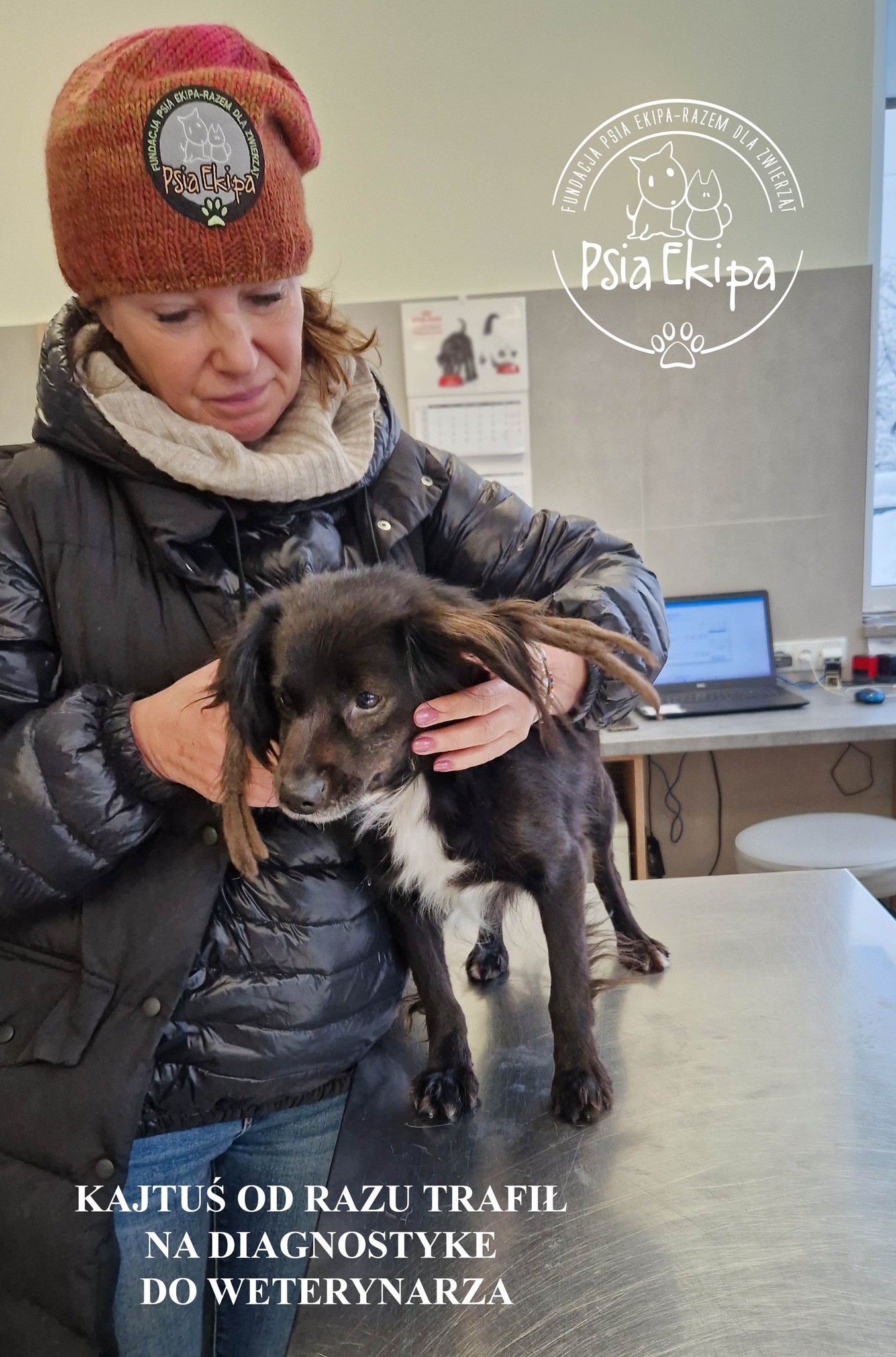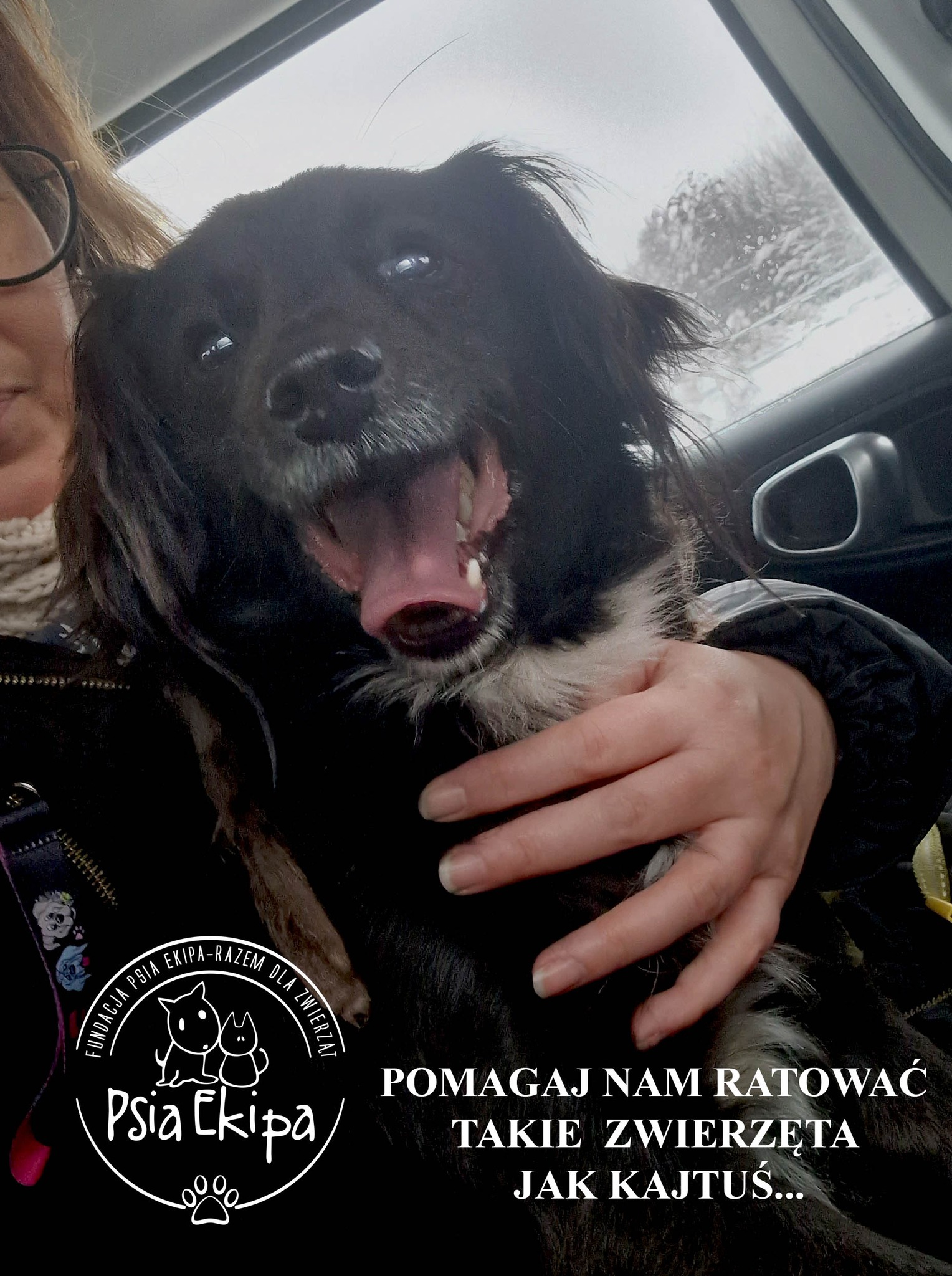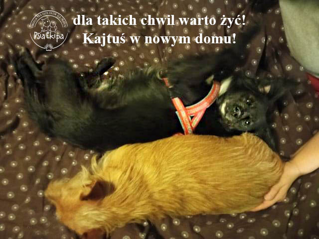 "Krótka historia - dlaczego właśnie Kajtek. W sierpniu odszedł od nas po 10 latach pies znaleziony na ulicy. Nie znaliśmy jego wieku, ani wcześniejszych losów. Została mała sunia i 3 koty Wystarczy - nie bierzemy żadnego psa, nie chcemy więcej rozstań, uhm... Którejś nocy przyśnił mi się , nasz psiak, a za nim biegł czarny piesek. Otworzyłam Fb i zobaczyłam filmik o Kajtku. Poczekałam, aż opadną emocje i zadzwoniłam. Teraz Kajtek jest "od zawsze nasz" i jest członkiem naszej rodziny"